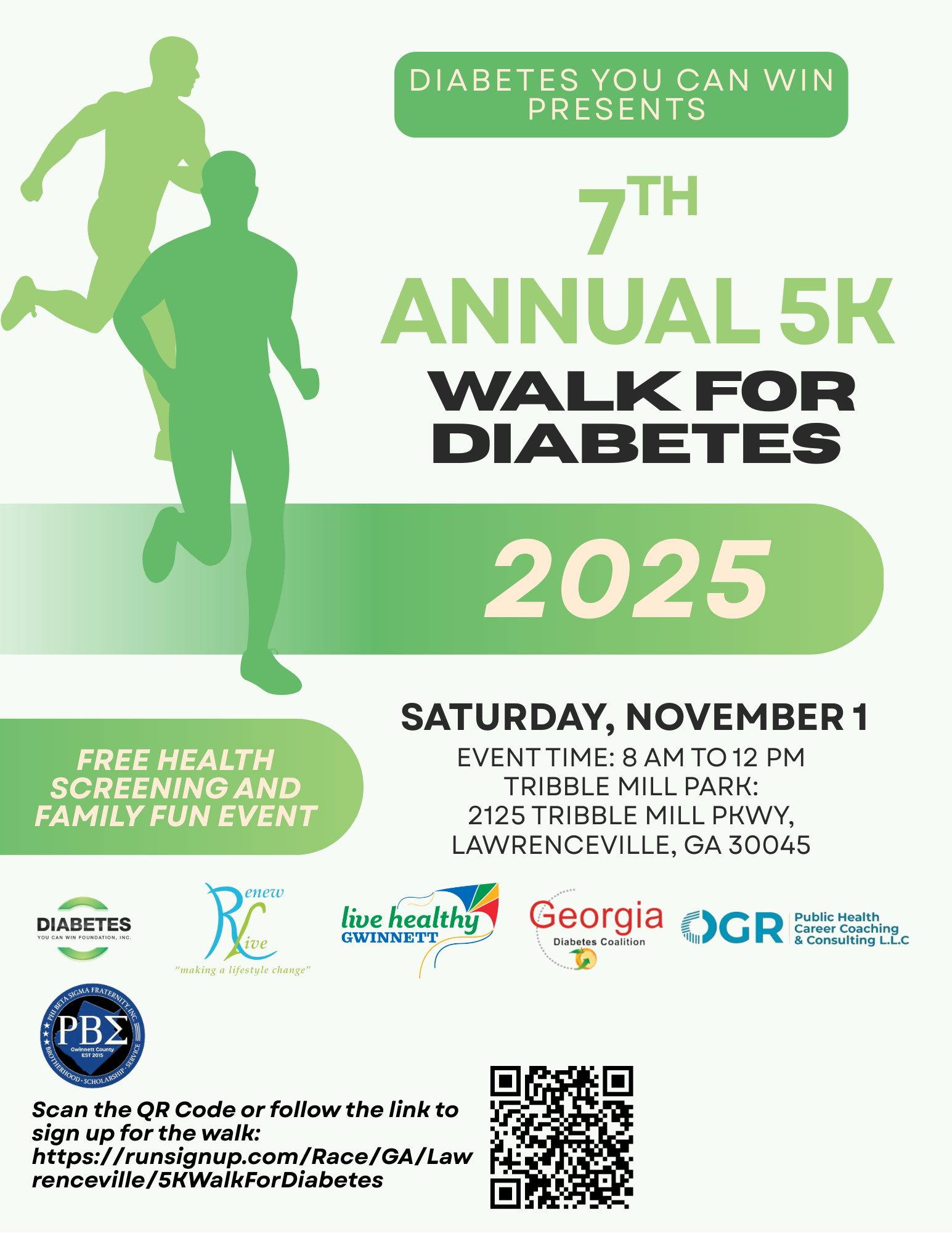 Join Live Healthy Gwinnett and Diabetes You Can Win for their 7th Annual Walk for Diabetes. This event will have free health screenings, resources, and giveaways. We hope to see you there! Registration via the QR code below is required. We will be meeting at the Holly Pavilion at Tribble Mill Park which is right behind the playground on Libsey Ln!