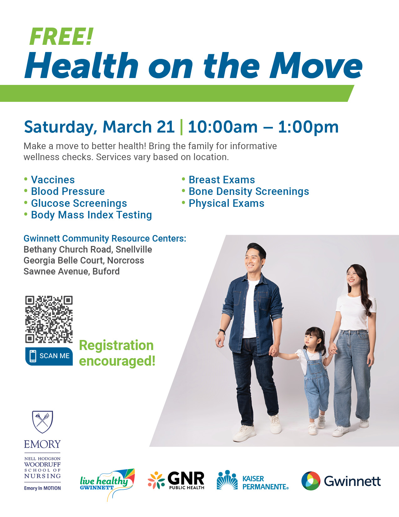 Join Live Healthy Gwinnett and our partners Emory in Motion, GNR Public Health, and Kaiser Permanente for Health on the MoveĀ and enjoy free health screenings and vaccines for you and the whole family. Enjoy screenings such as blood pressure, glucose screenings, breast exams, bone density screenings, etc. Services vary based on location; registration is strongly encouraged!