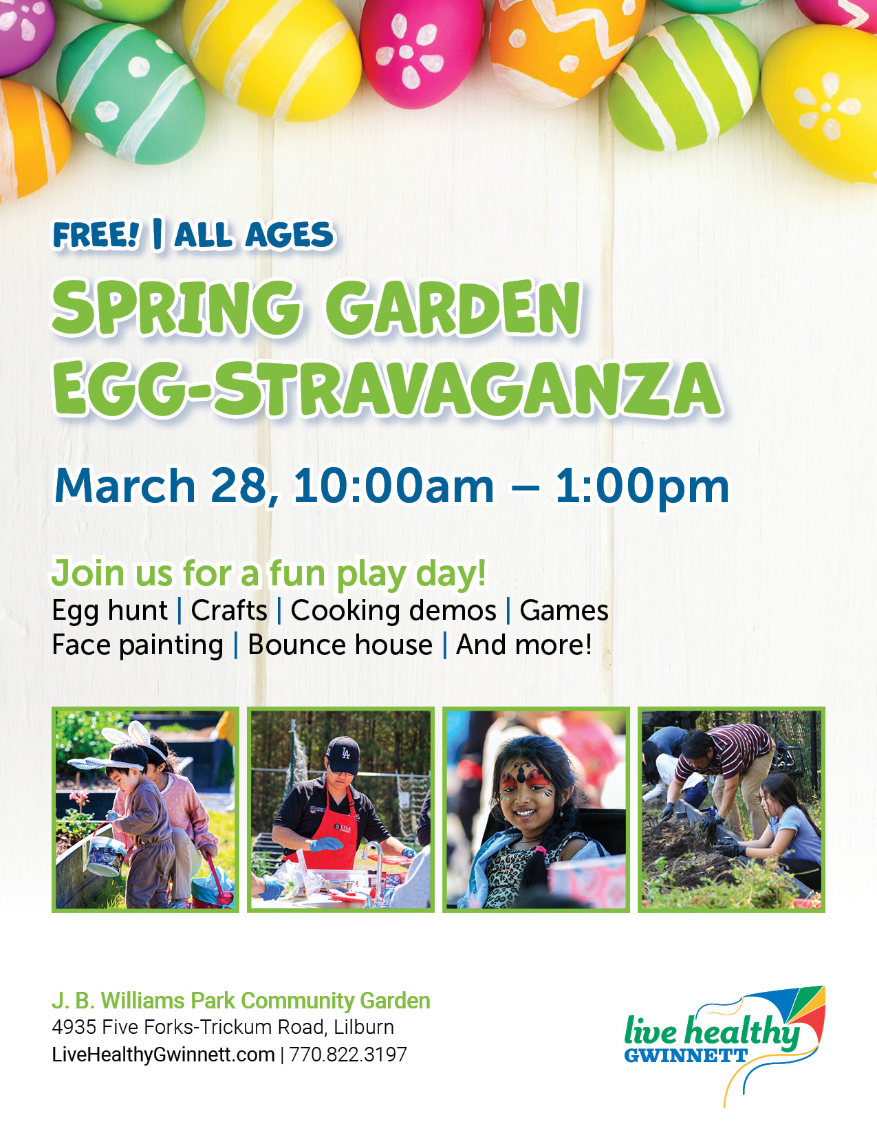 Free! Join Live Healthy Gwinnet and other community and county partners for crafts, cooking demos, games, face painting, bounce house, and a grand egg hunt in the garden! Celebrate Spring 2026 at J. B. Williams Park Community Garden, one of Gwinnett County’s beautiful community gardens, for a Spring Garden Egg-Stravaganza.